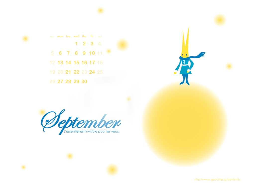 毎月公開しているオリジナル壁紙カレンダー。 2010年9月バージョンです。サイズは1024x768。他のサイズはウェブサイトよりどーぞ。 http://www.geocities.jp/penizm3/ 携帯用壁紙はウェブサイトの以下のページよりどーぞ。 http://www.geocities.jp/penizm3/i.html
