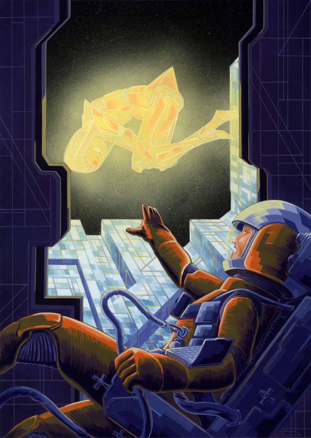 「何か新しいもの、何かが起ころうとしている」というコンセプトから。 なぞのガイノイド少女を、一人の宇宙飛行士が何かの理由でずっと探していた。そしてとうとう発見したが、ガイノイドは宇宙のかなたへと消え去ろうとしている。そんな感じです。