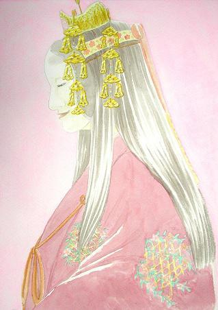天冠テンガン。桜の鬘帯。黒垂。長絹は格子に枝垂れ桜。