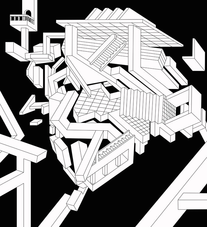 離れて見ると、建物(砦)がアインシュタインお顔に見えるトリックアート。大きな壁画を想定しています。