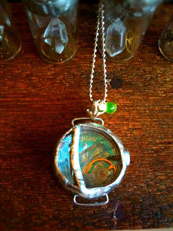 時計のケースに水晶と時計のパーツなどを入れて、ガラスで閉じ込めました。
