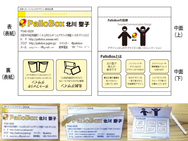 加工としては二つ折り名刺にミシン線を入れて上部を糊付けしただけですが、パッケージを開ける時のわくわく感を名刺でも味わっていただきたくて制作しました。