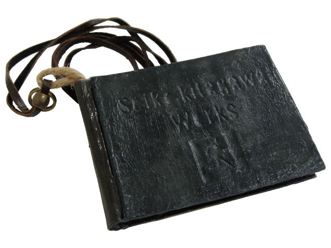 いつでもポートフォリオを持ち歩けるように豆本ペンダントにしました。正規のポートフォリオ制作のオプション品。表紙は厚紙とくしゃくしゃにした柔らかい紙を使ってエンボス加工をし、ニスを塗って皮のように仕上げました。現在中身をクリアファイルにできるように試行錯誤中です。