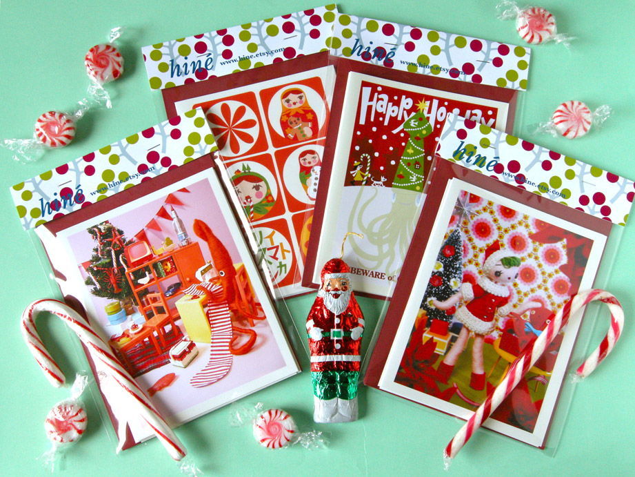 3枚1組クリスマスカードセット、全4種、Etsyショップで発売中。http://www.etsy.com/shop/hine
