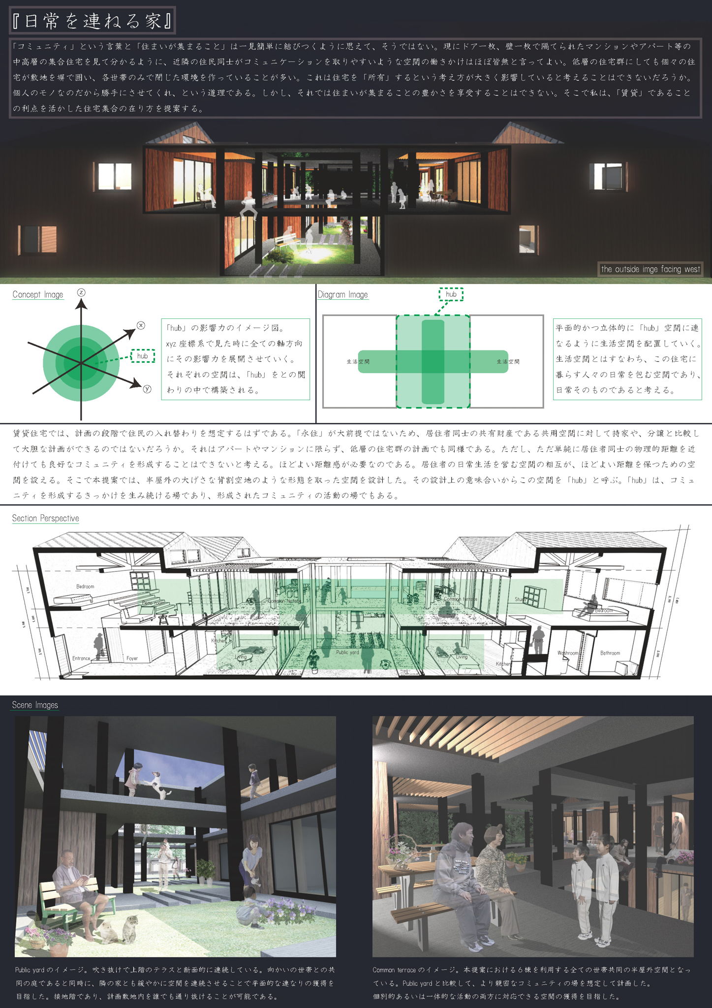 第2回JPM学生コンテスト「わたしの住みたいコミュニティー住宅」 において、全国賃貸住宅新聞社賞を頂いた作品です。以下、説明文となっています。
