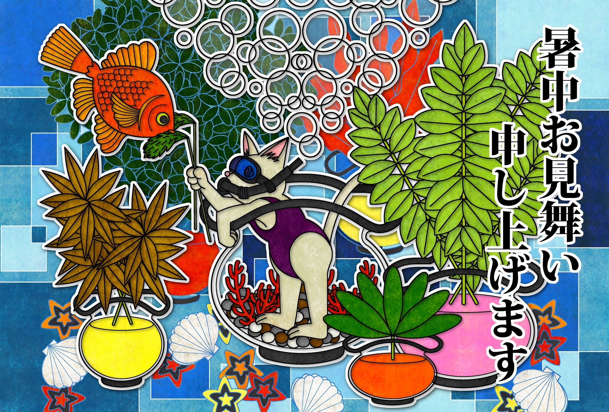 暑中見舞い,テンプレート,フリー素材,イラスト,暑中お見舞い申し上げます,猫,水着,夏,金魚,水中,