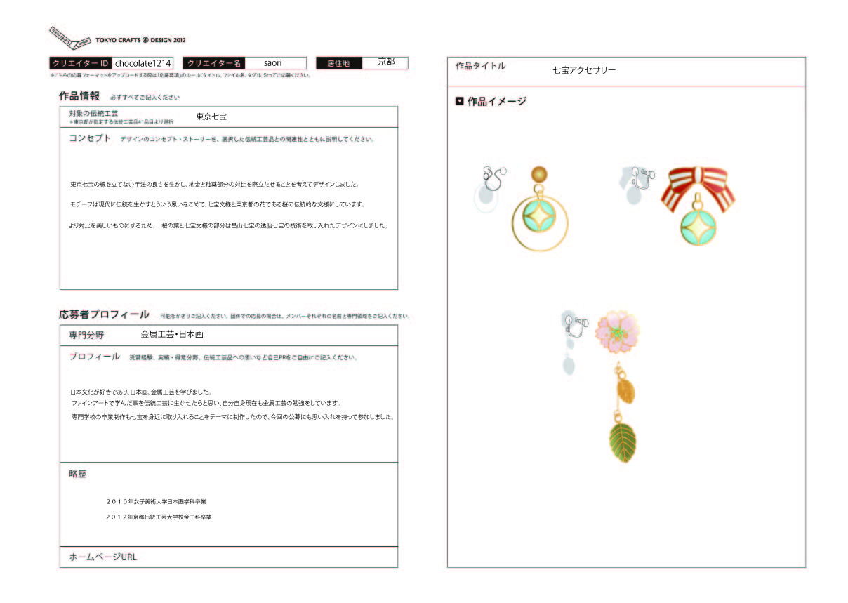 東京七宝の線を立てない手法の良さを生かし、地金と釉薬部分の対比を際立たせることを考えてデザインしました。モチーフは現代に伝統を生かすとういう思いをこめて、七宝文様と東京都の花である桜の伝統的な文様にしています。より対比を美しいものにするため、 桜の葉と七宝文様の部分は畠山七宝の透胎七宝の技術を取り入れたデザインにしました。