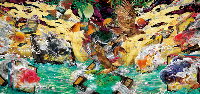 巨大な渦に向かっていく金魚とそこから逃げ出している鳥たち。