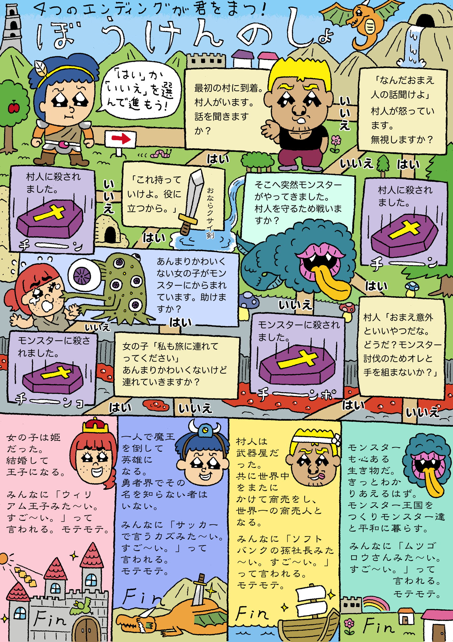 オリジナルゲームです。「はい」か「いいえ」を選んで進むチャート式RPGゲーム★4つのエンディングが君を待っているゾ!