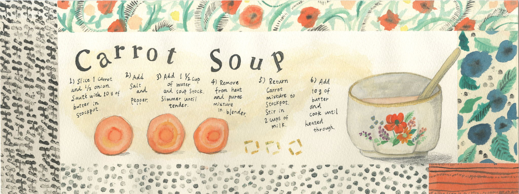消しゴムスタンプやステンシルを用いたり、食べ物を使って物語のイメージを表現し、小さなレシピ本を作ってみたりしました。