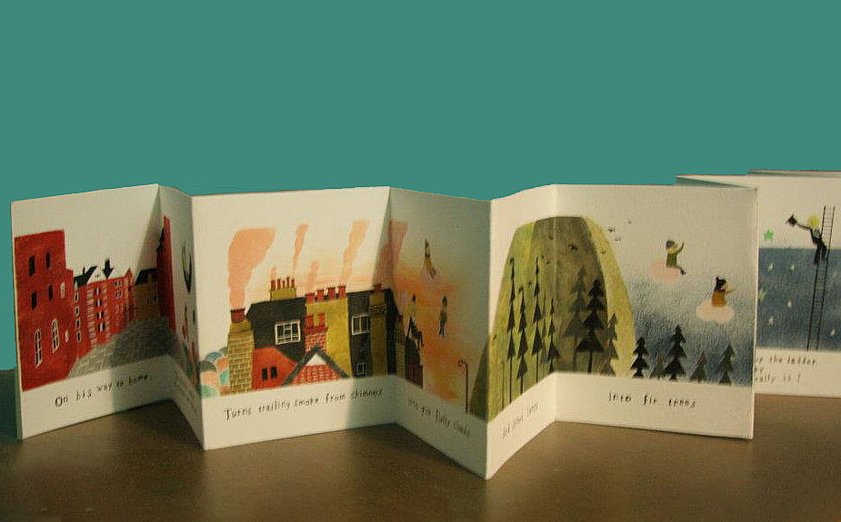 アコーディオンのように開くことのできる絵本。の試作品。ロンドンの街並をステンシルで描きました。