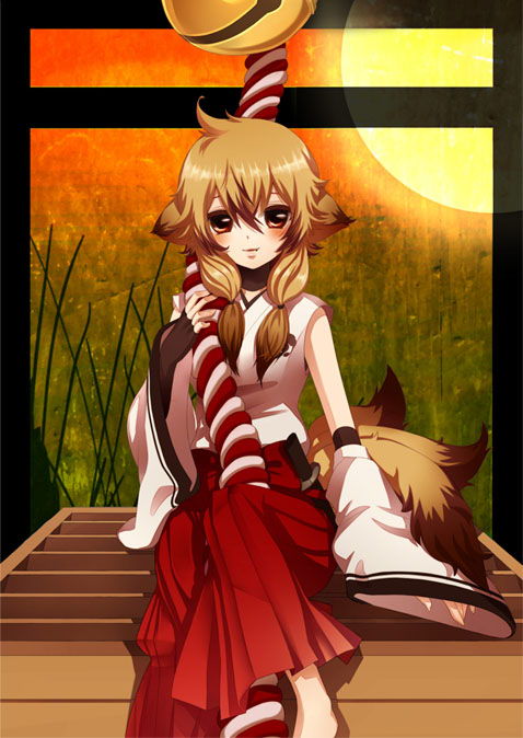 神社を一人で守っている狐の巫女さん。悪い輩がきたら腰の短刀で追い払います。