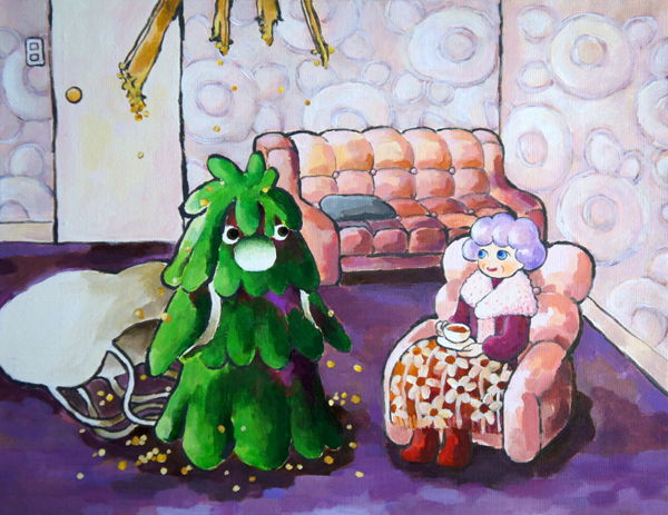 ある日、強風に煽られた木の子さんが、おばあちゃんの家の屋根を突き破って