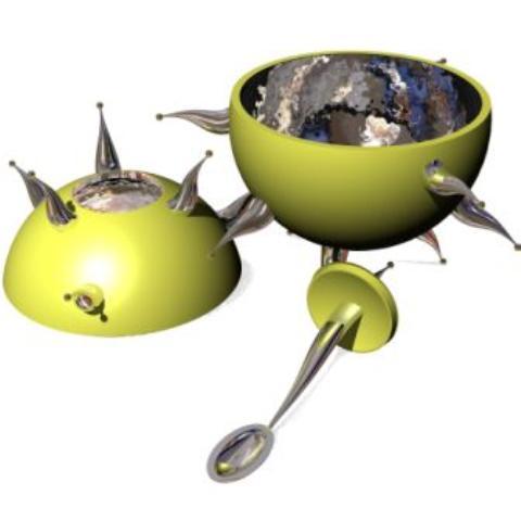 This design is for a table condiment set in polyamide and stainless steel. Itbridges a gap between fine dining and casual situations. It is inspired by natural forms in particular by Urchins and Corals. The polymer body shells allow strong colours to be employed and resist the corrosive effects of the contents. The size is practical for domestic use whilst being ergonomically functional to hold and the assembly allows for easy batch production. It brings colour and a talking point to dinner parties where it becomes a 'table sculpture' as well as functional object. The materials and appearance make it suitable for an informal gathering of friends.