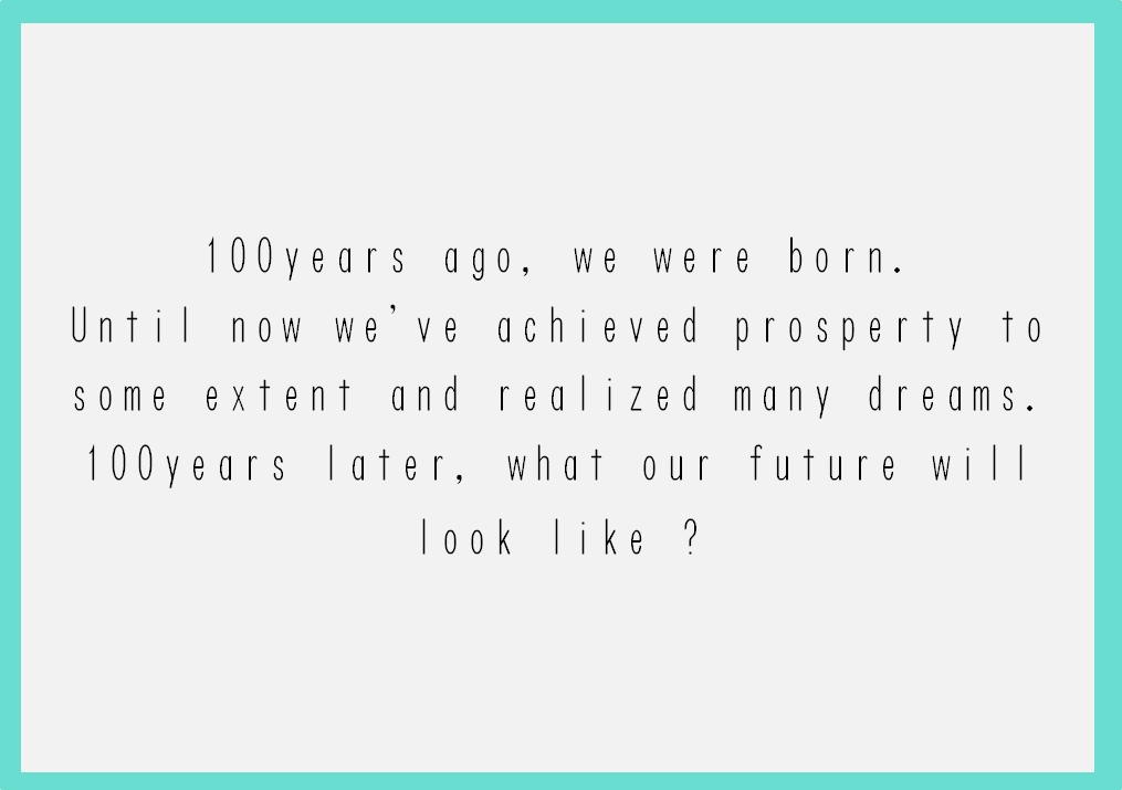 "100years ago, we were born. Until now we've achieved prosperty to some extent and realized many dreams. 100years later, what our future will look like ?"