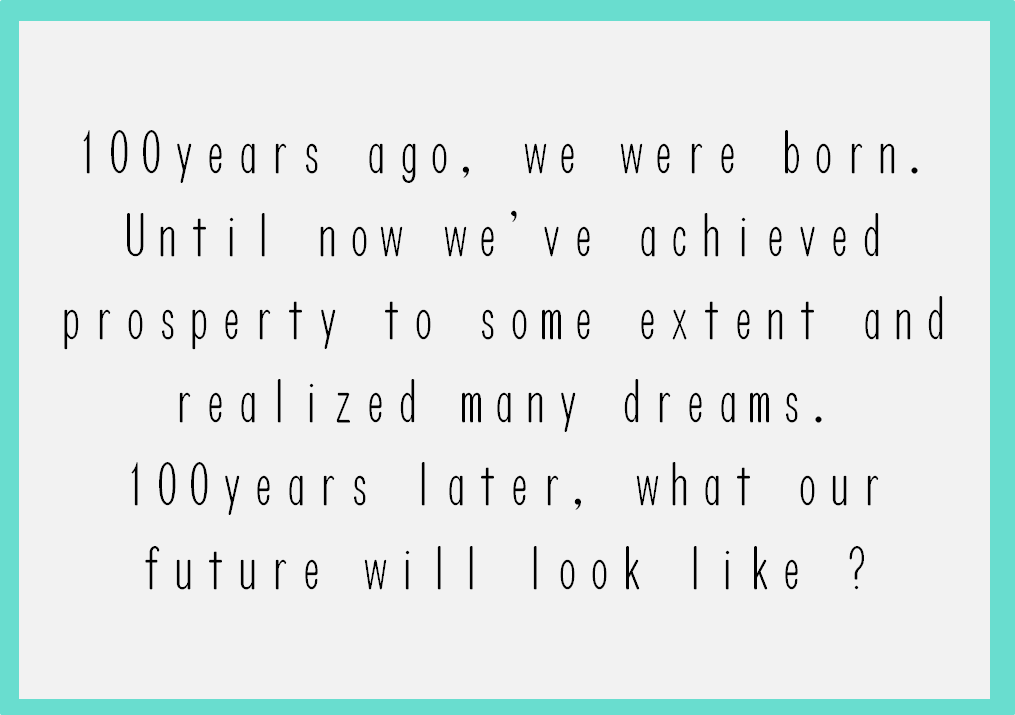 "100years ago, we were born. Until now we've achieved prosperty to some extent and realized many dreams. 100years later, what our future will look like ?"