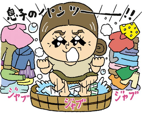 主婦雑誌「おはよう奥さん」で描いたイラストです。「WEラブ姑図鑑」というコーナーでいろいろな姑さんを描きました。こちらの姑さんは洗濯機を使わずすべて手洗い、いや、足踏み洗いする姑さん。息子のパンツーーーーー!