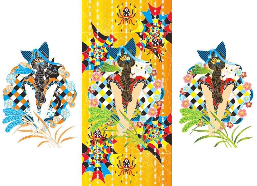 イラスト 少女 ガール 猫 鳥 植物 花 ポニーテール カラフル