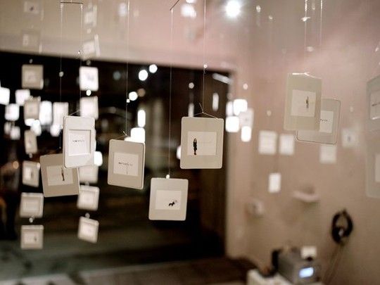 人が集まる場所にいる人たちを描き、その裏にささやかな願いを書いた小さいパーツを沢山吊るしました。