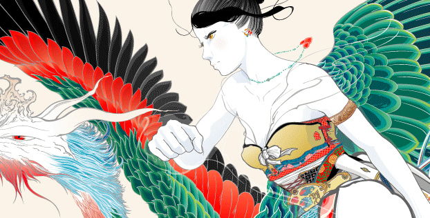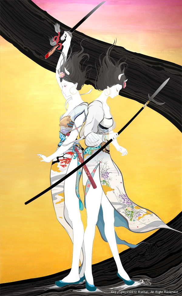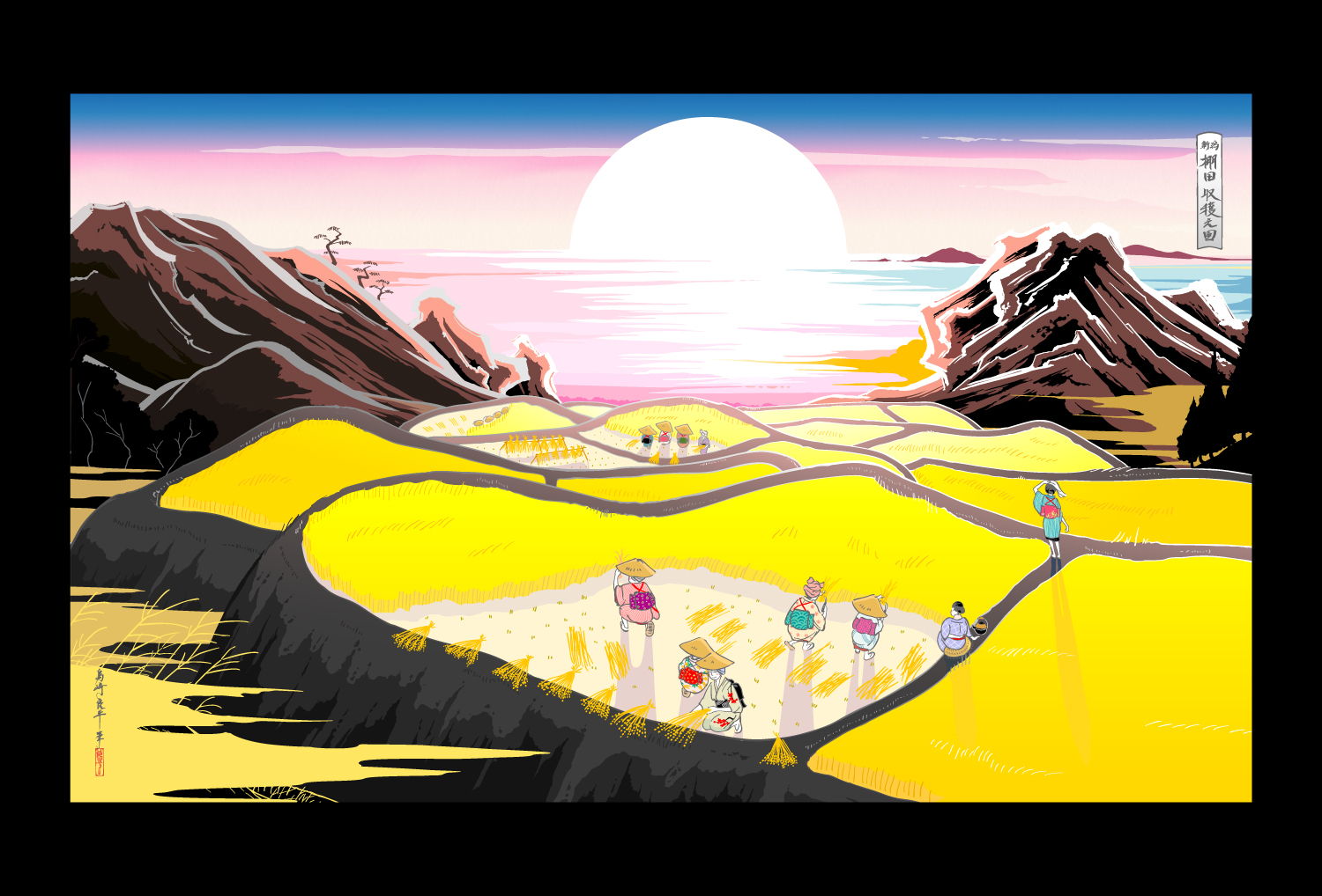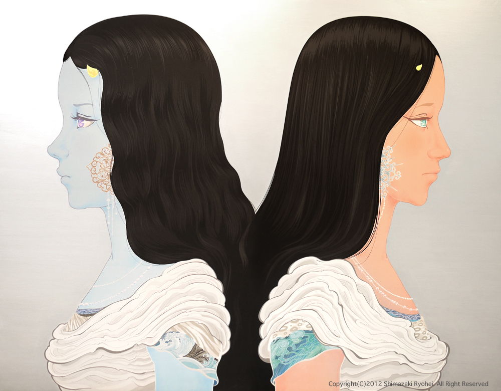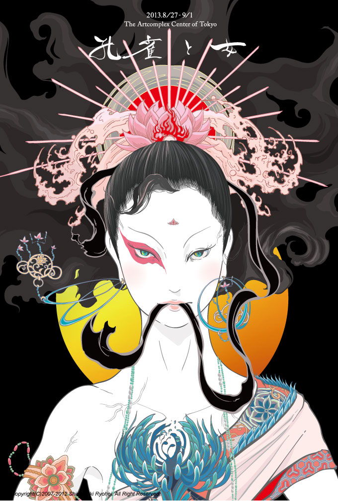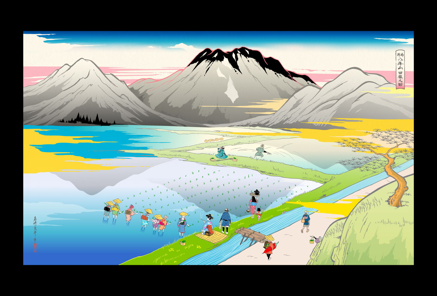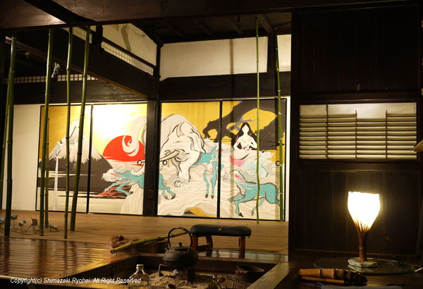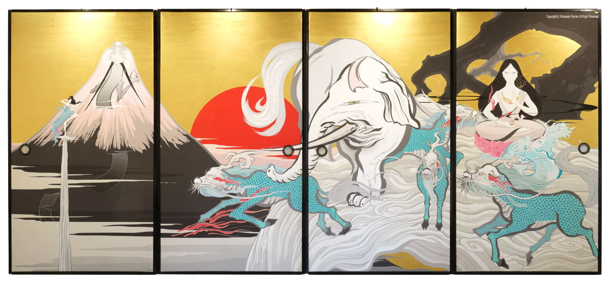 デジタルプリントの上に手彩(顔彩、金泥雲母、金箔、銀泥)