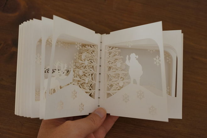 ページを一枚一枚レーザーカットして、360°開くと立体ジオラマが現れる絵本「360°Book」のクリスマスバージョンです。大きな樅の木が生えているどこかの森の、雪降るクリスマスのワンシーンを切り取りました。