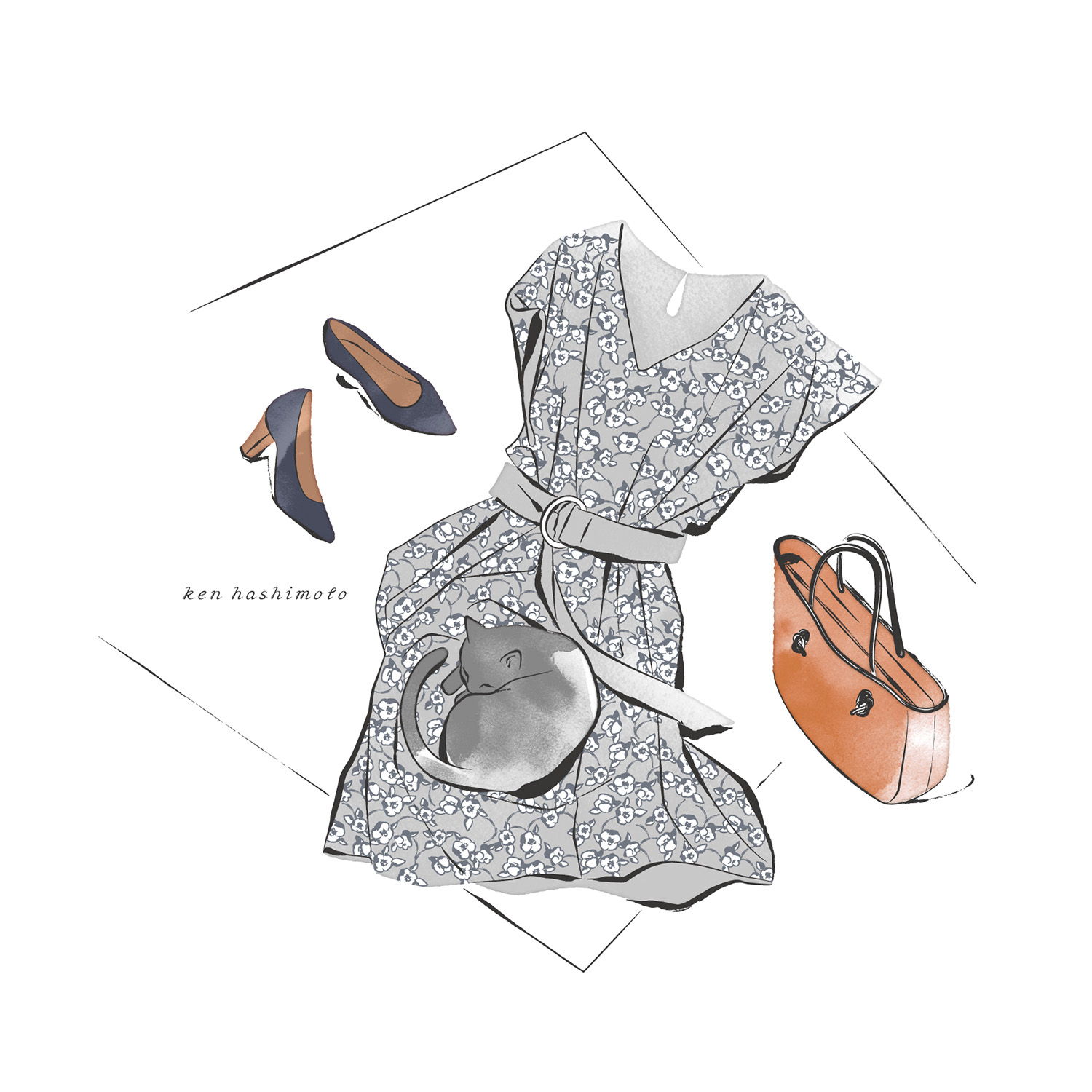 ファッション / ワンピース / 花柄 / ネコ / バッグ / パンプス / イラスト