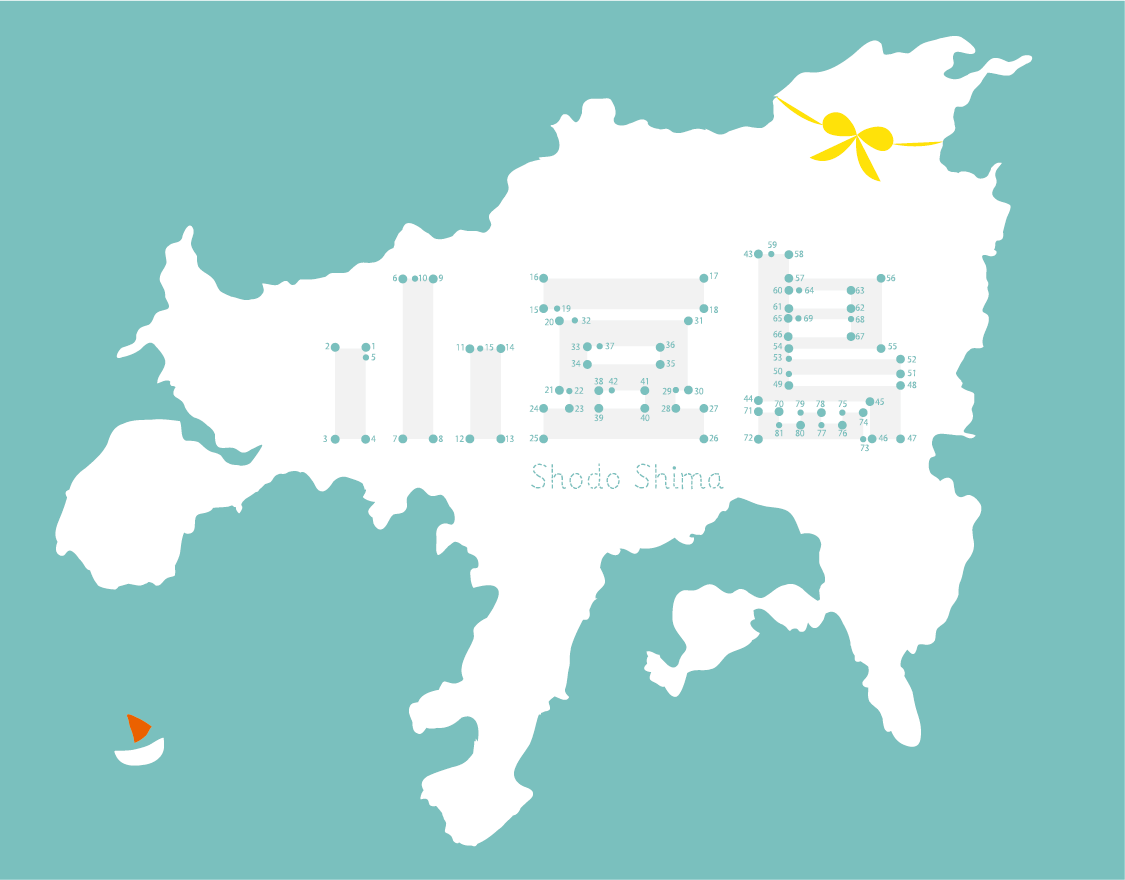島と人を、そして人と人とを「つなぐ」。そんな小豆島のあり方を、そして名産物豊富でクリエイティブなこの島を「点つなぎ」で表してみました。1~81までふってある番号を順に繋いでいくと「小豆島」という文字が浮かび上がります。