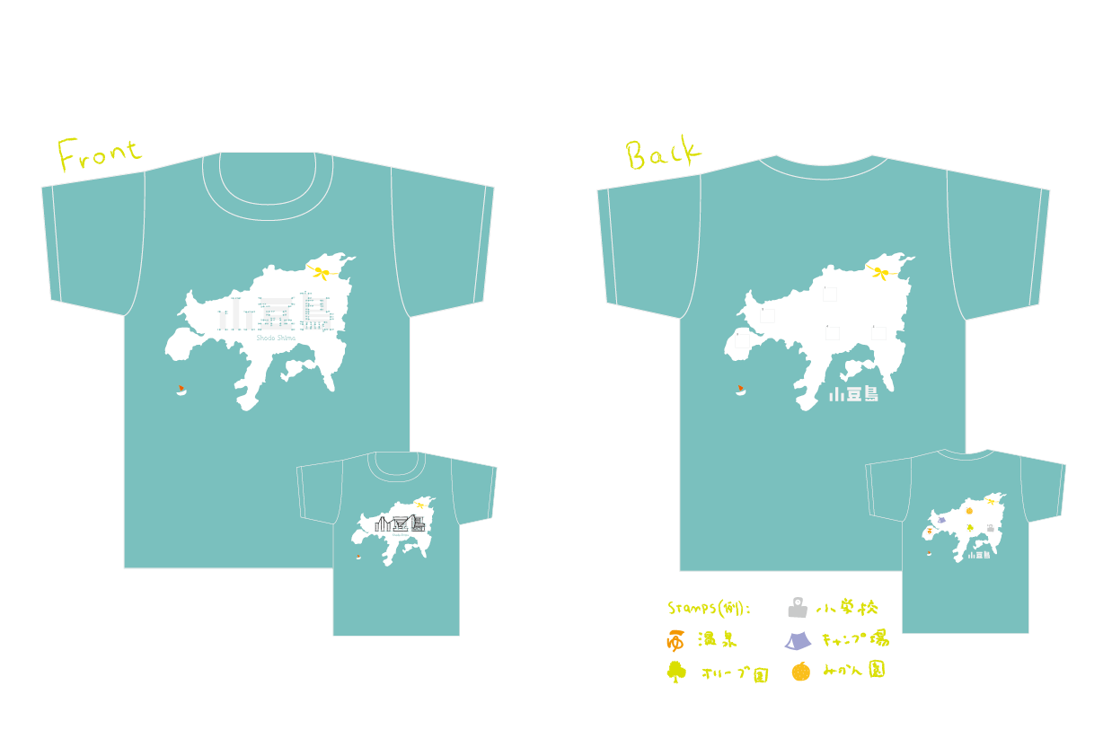 裏面は、スタンプラリーできるようにしました。布用のカラフルなスタンプを名所ごとに用意して、島を巡回しながら押していく。たのしいですね。記念のTシャツになります。そして、全部巡った人には素敵な記念品が!なんて事になったら、ますます小豆島ファンになること間違いなしです。