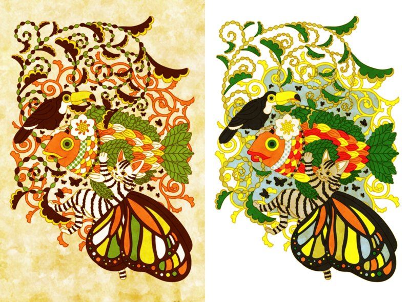 illustration cat colorful fish Tocotoucan butterfly plant