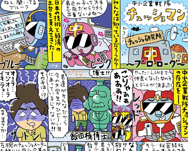 「タダコピ」という大学生向けの広告で描いた漫画です。(画像は第1話の一部です。)とにかく大手企業に行きたくなってしまう呪いにかかってしまったサトシ。しかしチュッショマン達が中小企業の良さを教えてサトシを救う!みんなは気づいてくれただろうか、中小企業戦隊チュッショマンの存在にー。
