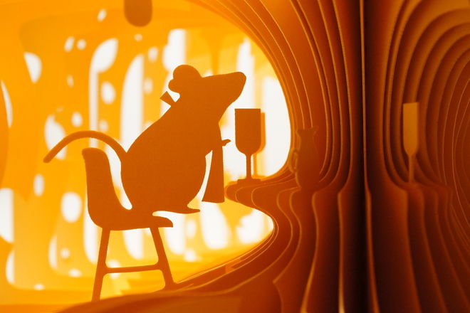 ページを一枚一枚レーザーカットして、360°開くと立体ジオラマが現れる絵本「360°Book」。大きなチーズの中で、ねずみたちが楽しそうに暮らしています。