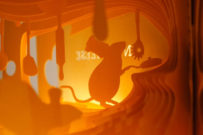 ページを一枚一枚レーザーカットして、360°開くと立体ジオラマが現れる絵本「360°Book」。大きなチーズの中で、ねずみたちが楽しそうに暮らしています。