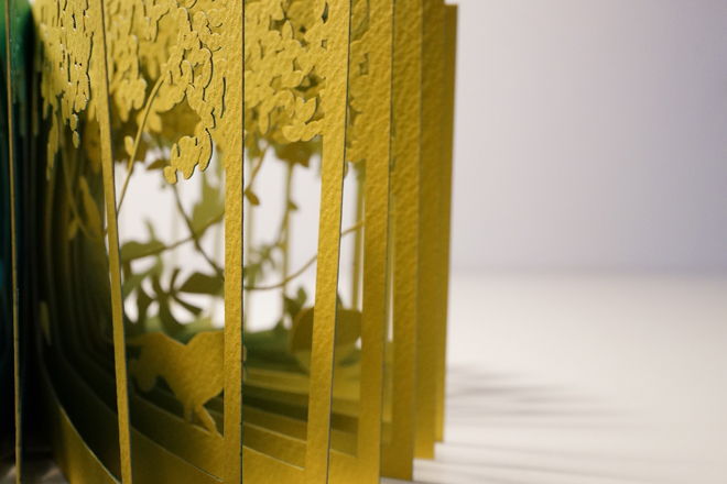 ページを一枚一枚レーザーカットして、360°開くと立体ジオラマが現れる絵本「360°Book」。草木が生い茂るジャングルの中に、野生の動物がたくさん隠れています。