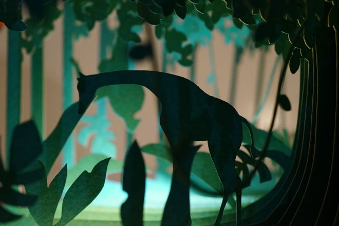 ページを一枚一枚レーザーカットして、360°開くと立体ジオラマが現れる絵本「360°Book」。草木が生い茂るジャングルの中に、野生の動物がたくさん隠れています。