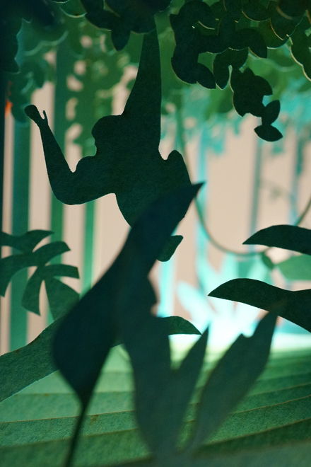 ページを一枚一枚レーザーカットして、360°開くと立体ジオラマが現れる絵本「360°Book」。草木が生い茂るジャングルの中に、野生の動物がたくさん隠れています。