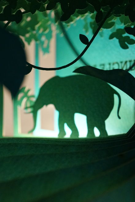 ページを一枚一枚レーザーカットして、360°開くと立体ジオラマが現れる絵本「360°Book」。草木が生い茂るジャングルの中に、野生の動物がたくさん隠れています。