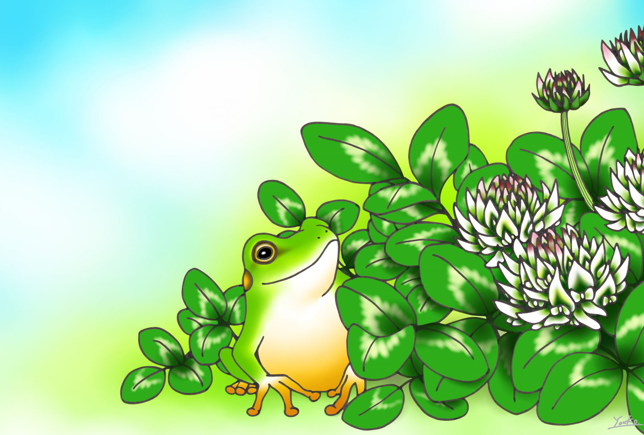 ヒバリのさえずりが響く、シロツメクサとレンゲが咲き乱れる田んぼの中から『ケッ、ケッ、ケッ』という可愛い声が聞こえてきました。もう少しで田んぼに水が入る美しい季節になります。私も蛙君も待ち遠しい!
