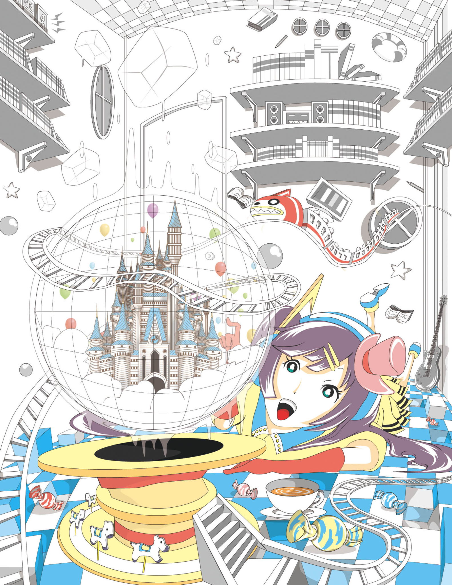 部屋の中で遊べるような楽しい遊園地を想像して描きました。 制作ソフトCS3