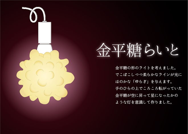 手のひらの上でころころ転がっていた金平糖が空に昇って星になったかのような灯を意識して作りました。