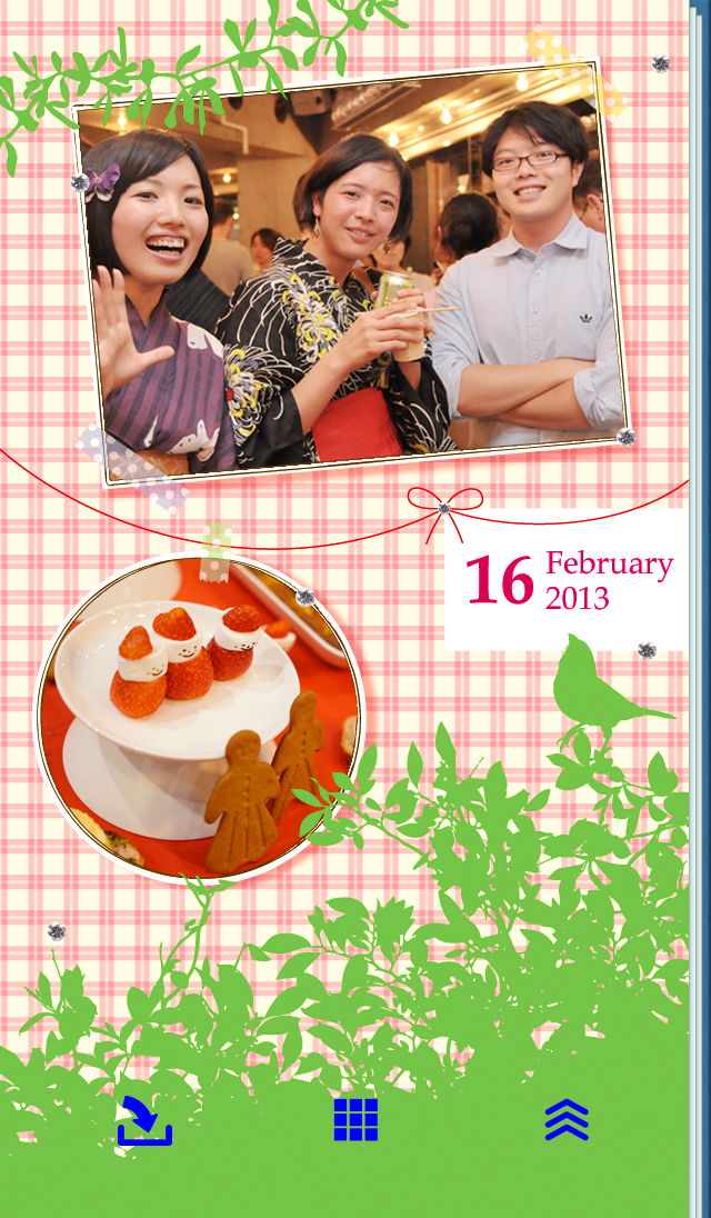 写真が引き立つように装飾はシンプルに、それでいて目を引くようにピンクと緑を使ったデザインにしてあります。フレームのかたちもシンプルに、端をクラフトテープで止めたデザインにすることで、アナログ感を出しています。また、オブフェクとの配置や、影をつけることで、写真とフレームが一体化しないようにメリハリをつけ、奥行きを出しました。