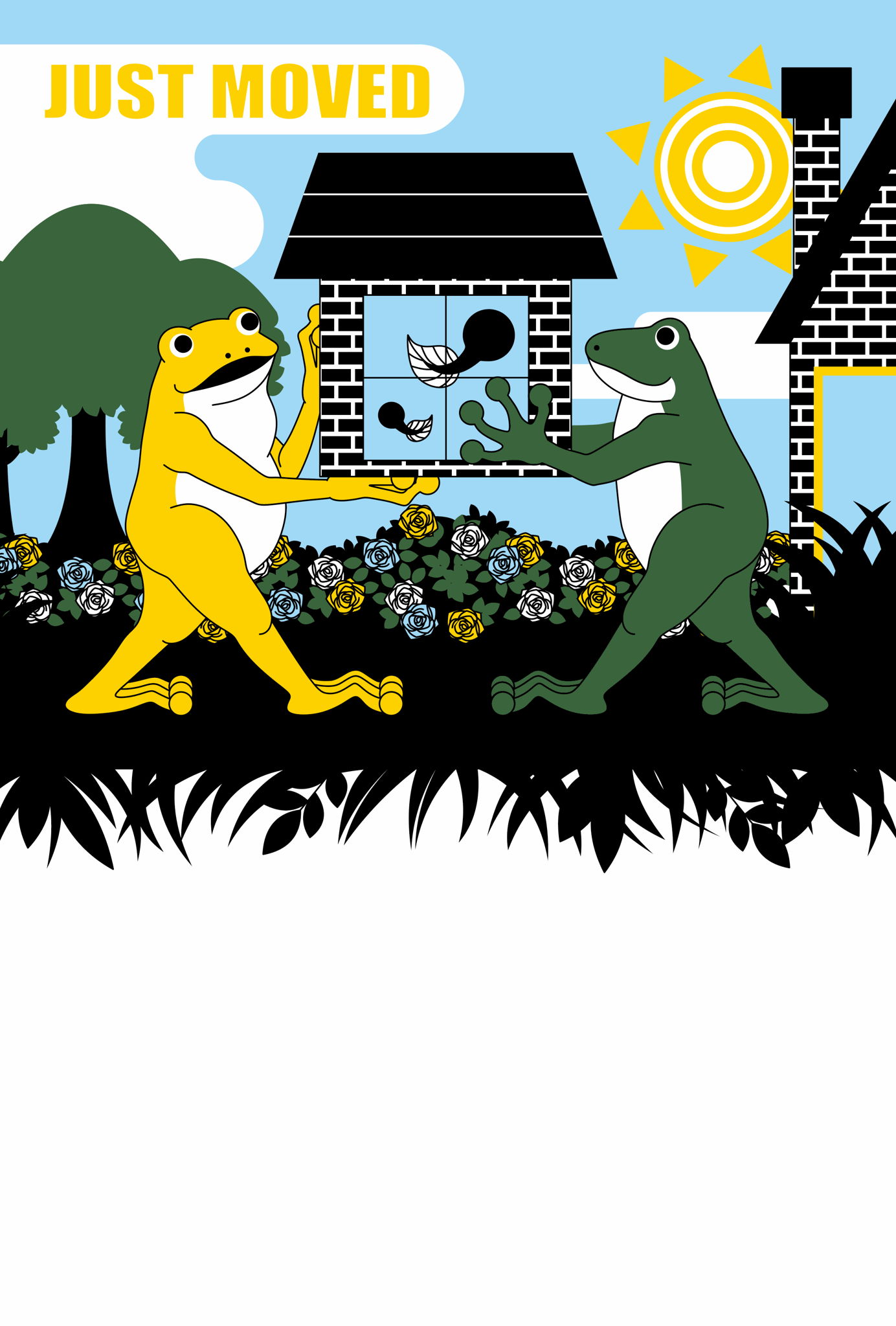 蛙,かえる,カエル,家,転居報告,転居通知,引越し,挨拶状,ポストカード,テンプレート,イラスト,デザイン,フリー素材,