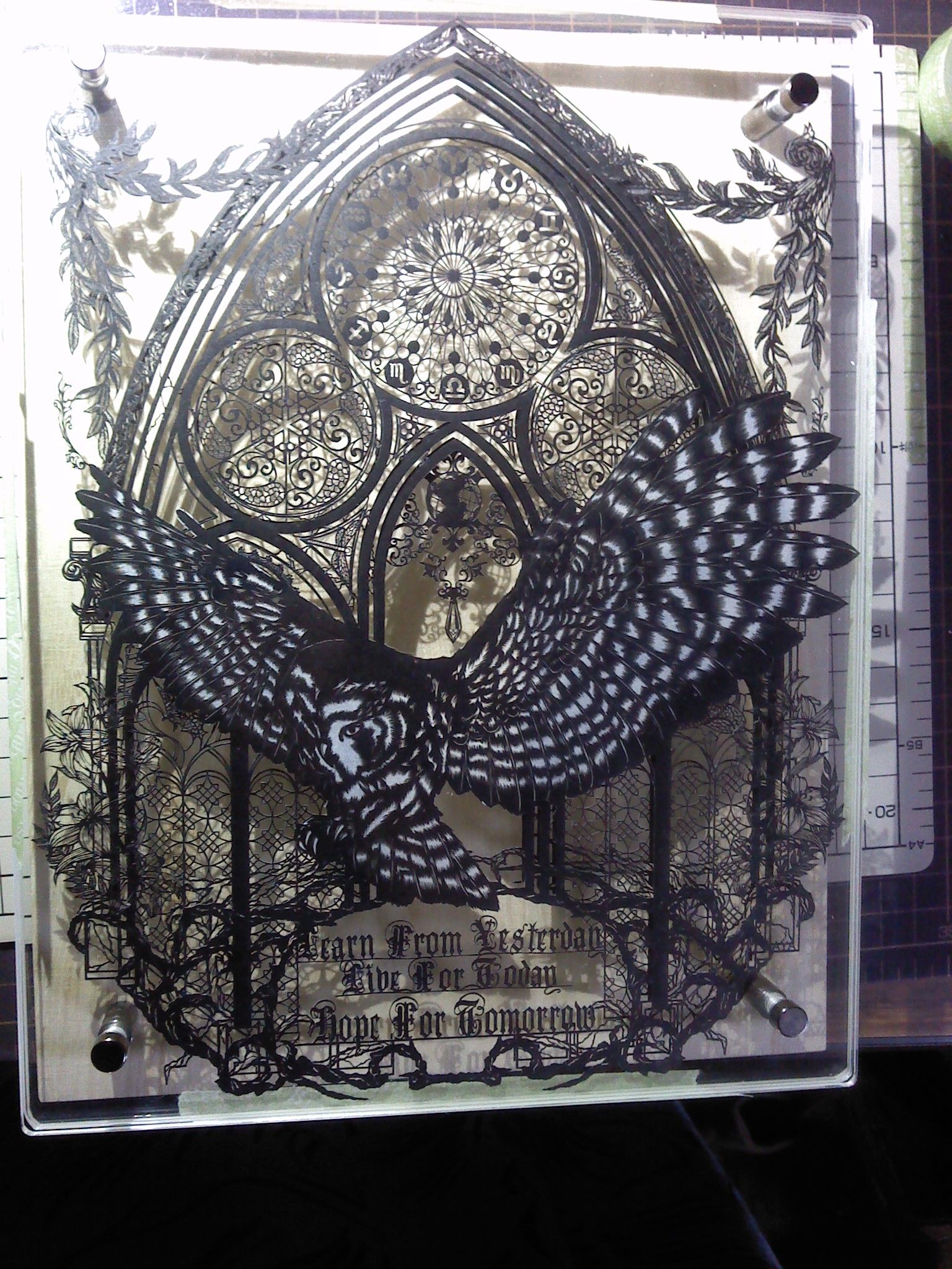 下の切り絵が細かくて梟が目立たなくなったので急遽トレーシングペーパーをあてました。