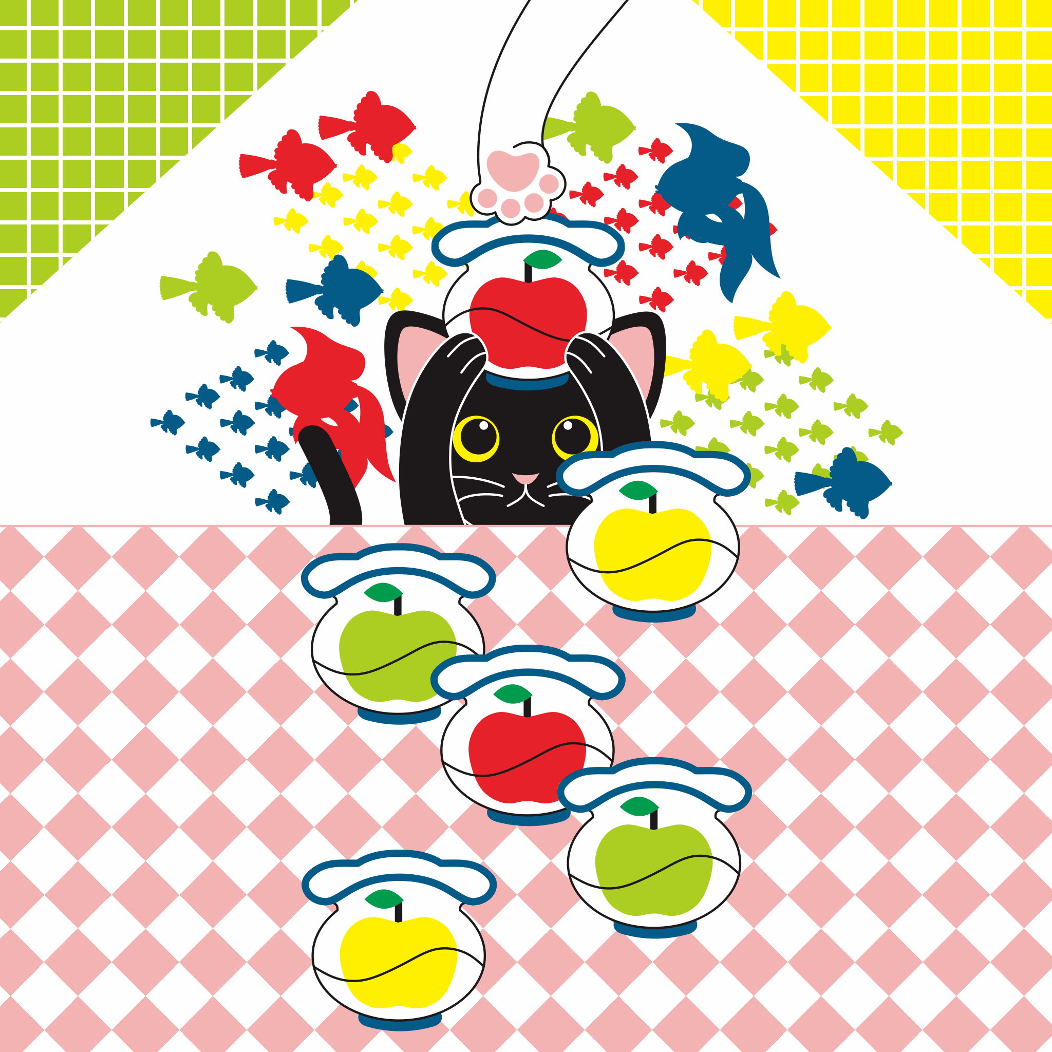イラスト,デザイン,猫,かわいい,林檎,金魚鉢,肉球,金魚,シルエット,影,
