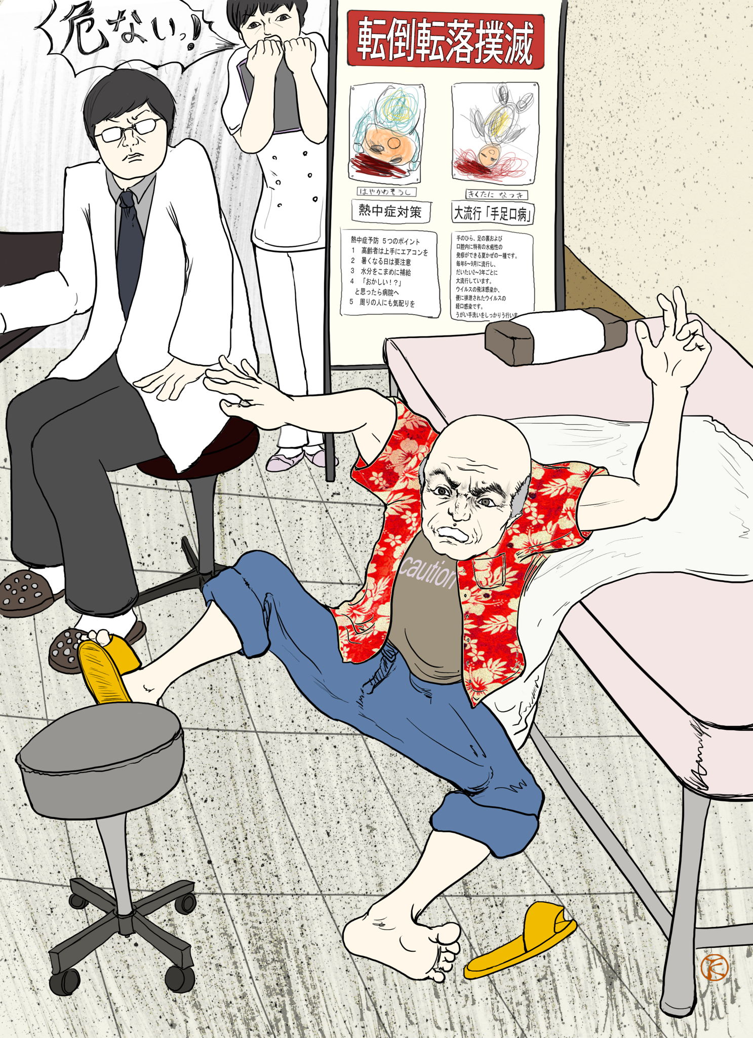 病院で最近お子様やお年寄りに多いのが診察ベッドからの転落ということで、病院側がポスターで注意を呼びかけるために制作。手前の男性は私の知人をモデルにしてます。胃の検査の結果を聞きに病院に行ってスリッパですっころんで脚を怪我してそのまま病院で診てもらったらしいです。ぴったりな人が居て幸運でした。