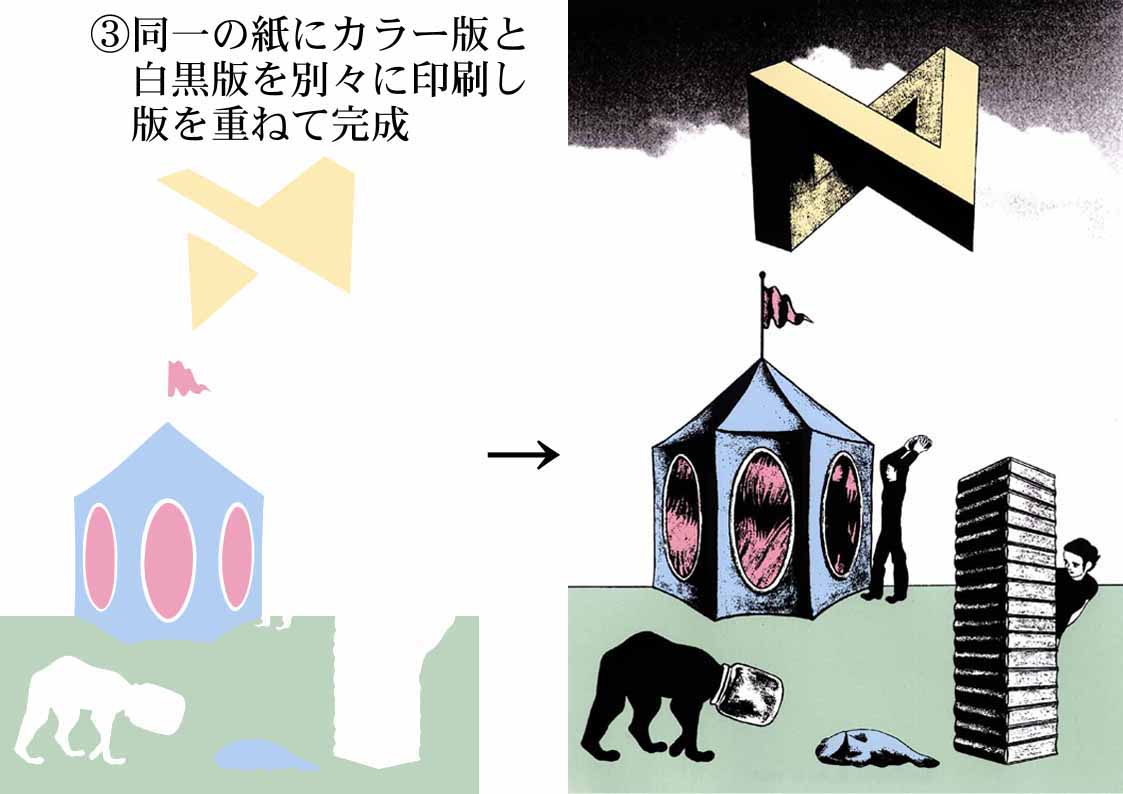 白黒版を元にしてIllustratorでカラー版を作り、同じ紙に二回印刷することで二つの版を重ねる。