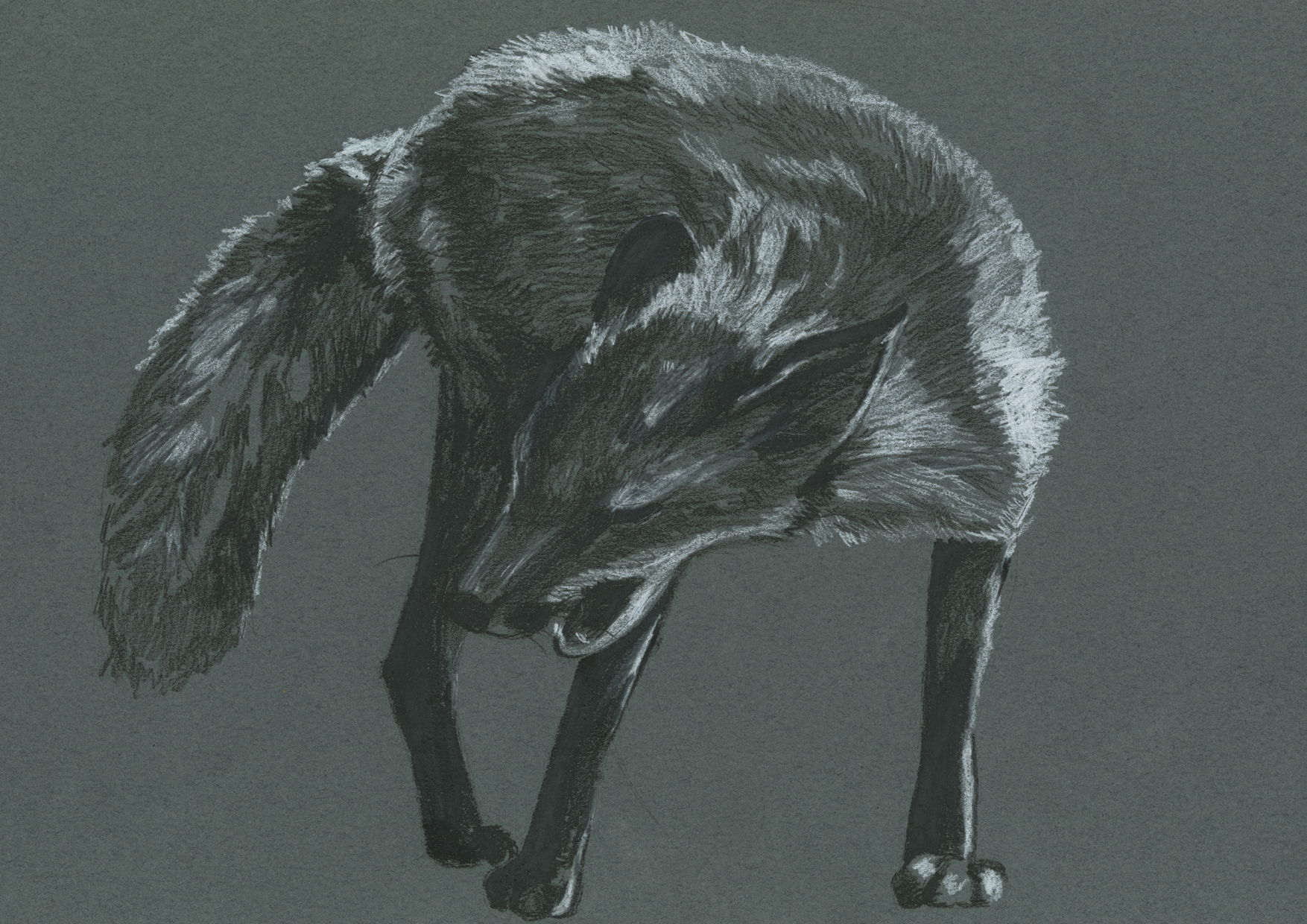 白と黒のダーマトグラフでグレーのケント紙に描いたデッサン。狐の全身です。