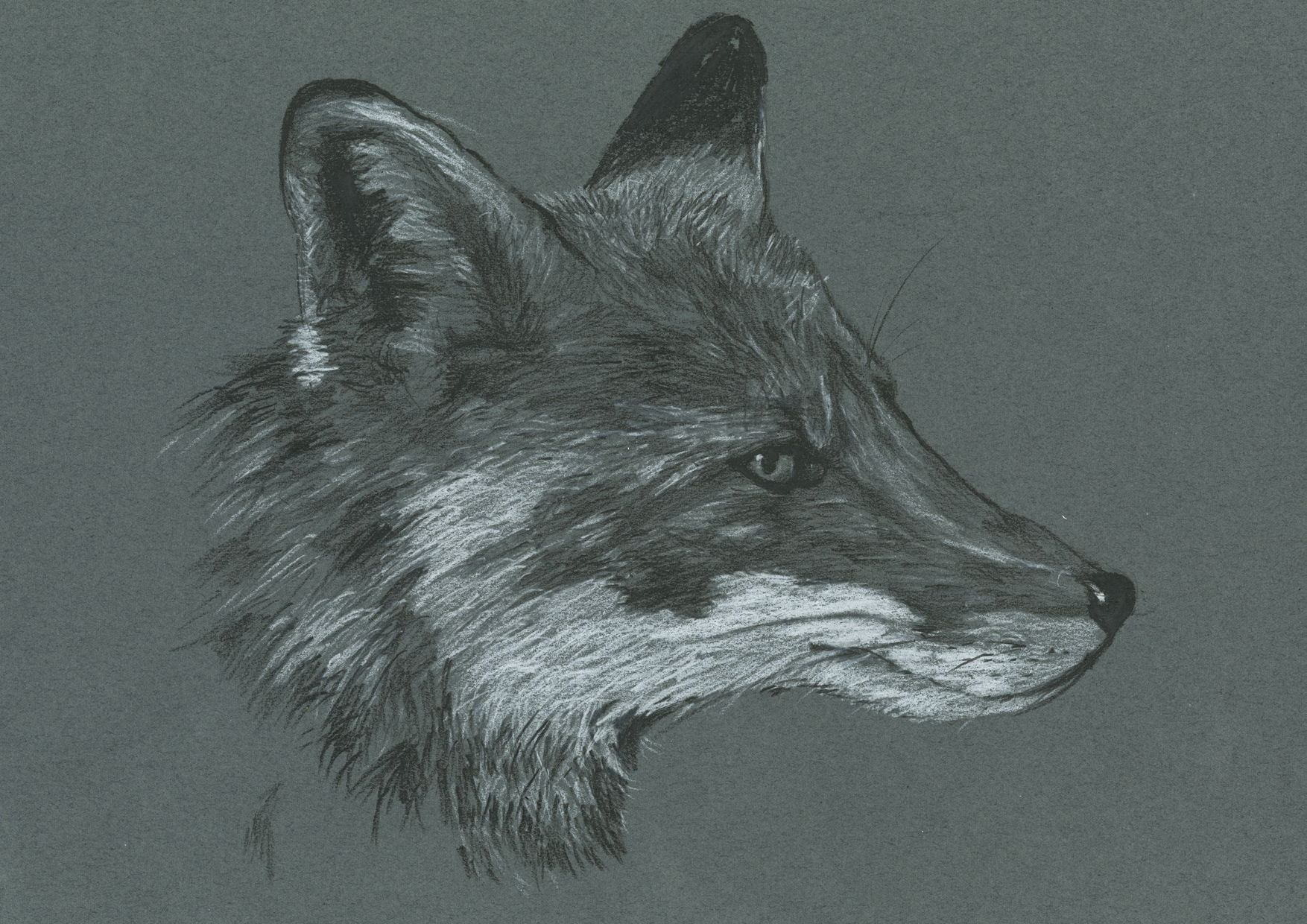 白と黒のダーマトグラフでグレーケントに描いたデッサンです。狐の顔のアップで光の具合に注意して描きました。