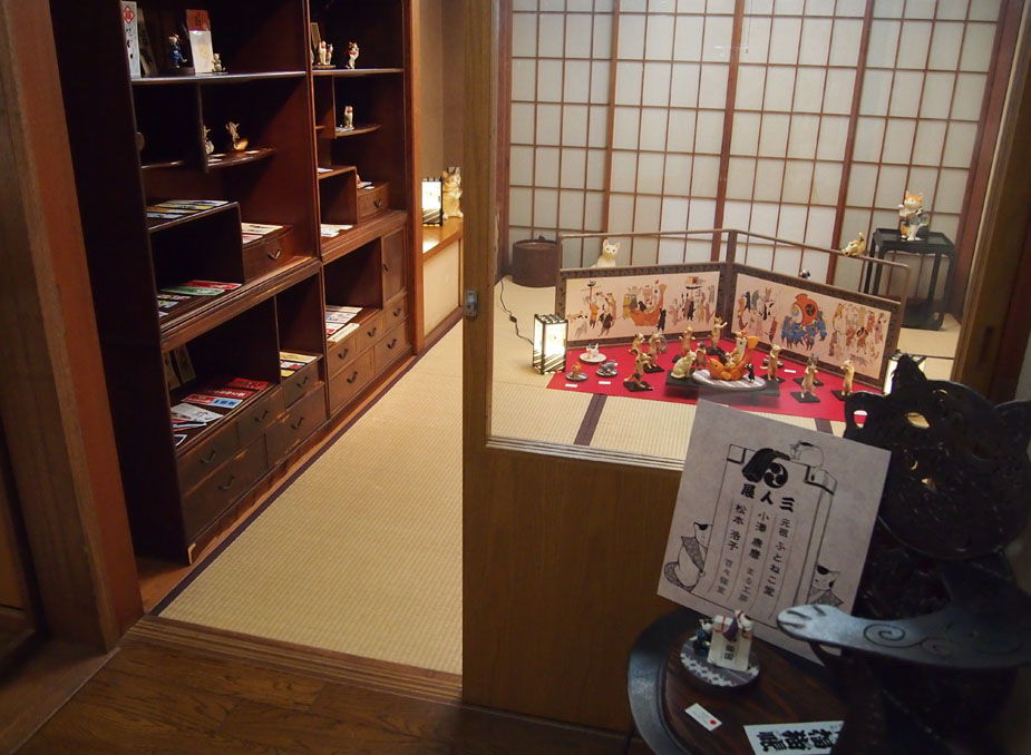 陶人形作家・小澤康麿、粘土人形作家・松本浩子、絵師・元祖 ふとねこ堂による三人展の会場風景です。