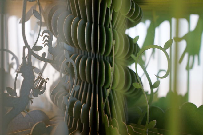 ページを一枚一枚レーザーカットして、360°開くと立体ジオラマが現れる絵本「360°Book」。ジャックと豆の木の世界が小さな本の中に広がっていきます。