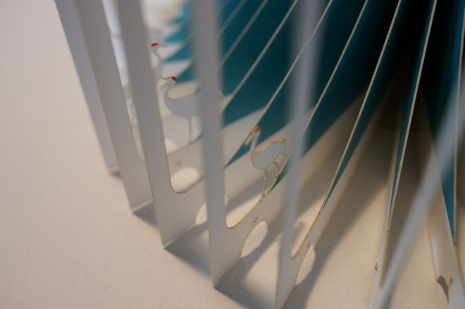 ページを一枚一枚レーザーカットして、360°開くと立体ジオラマが現れる絵本「360°Book」。雄大な富士山、雲そして鶴たちが日本の美を醸し出します。